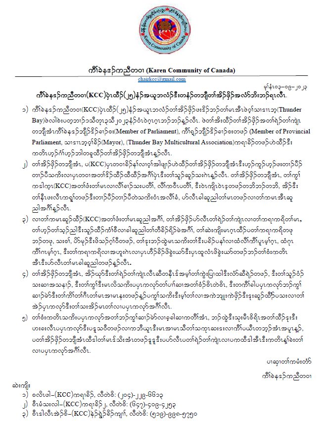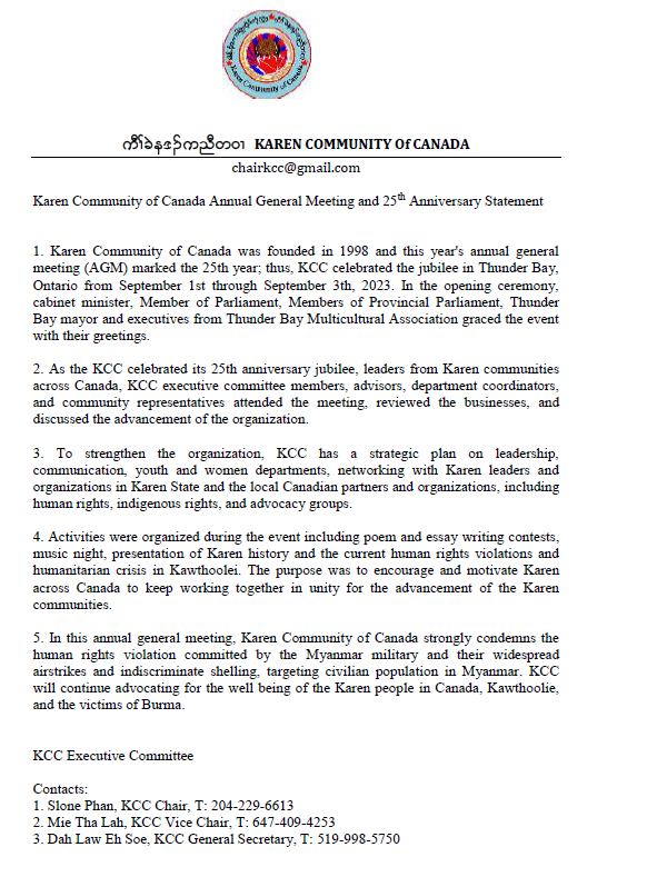 Karen Community of Canada Holds Annual General Meeting in British Columbia The Karen Community of Canada (KCC) convened its Annual General Meeting (AGM) from August 31st to September 1st in Chilliwack, British Columbia. Over the course of two days, twenty representatives from various Karen communities across Canada gathered to review the organization’s activities, assess decisions…